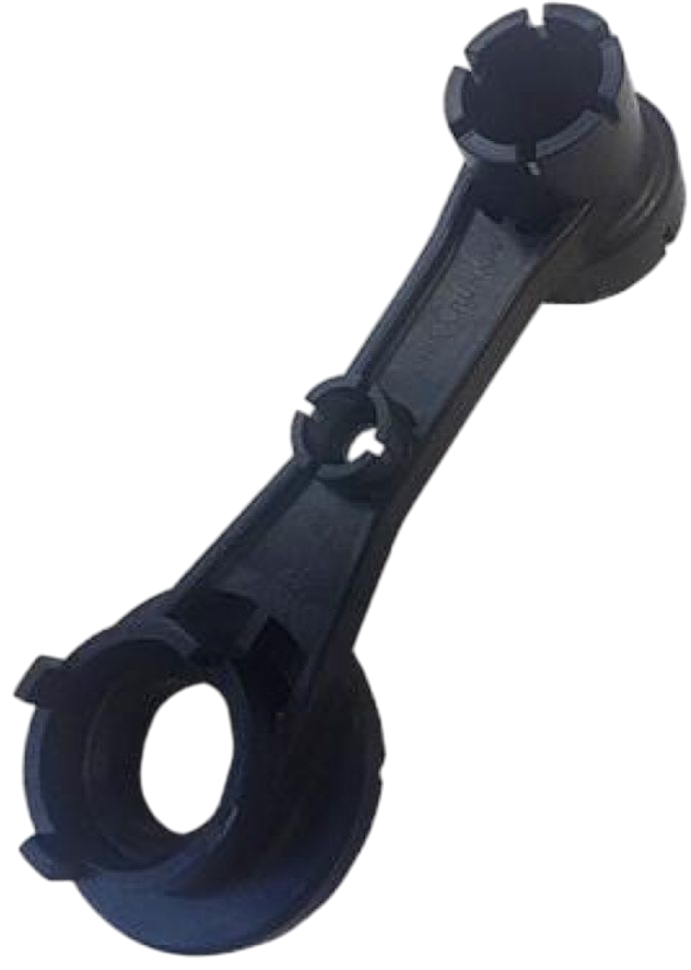 Состоит из рукоятки, в центре которой находится разъем для одного из элементов клапана минимального размера. На каждом из концов клапана расположен разъем — большего и меньше размера. При помощи данного ключа происходит ослабление и затягивание гаек дренажной линии, реагентной линии, входа исходной и выхода очищенной воды.